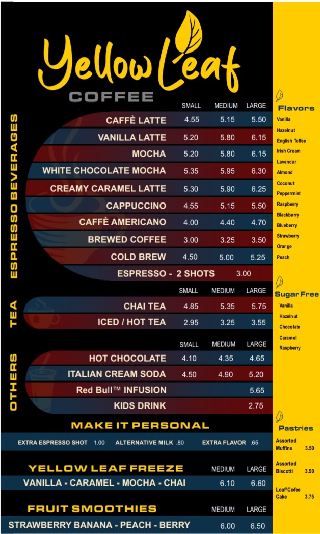 The Yellow Leaf Coffee menu offers a simple yet inviting selection focused on comforting drinks that fit perfectly into your daily routine. Whether you're stopping by for a smooth hot mocha to start your morning or craving one of their refreshing cold mixes like an iced coffee or a caramel freeze, the choices are designed to satisfy without fuss.